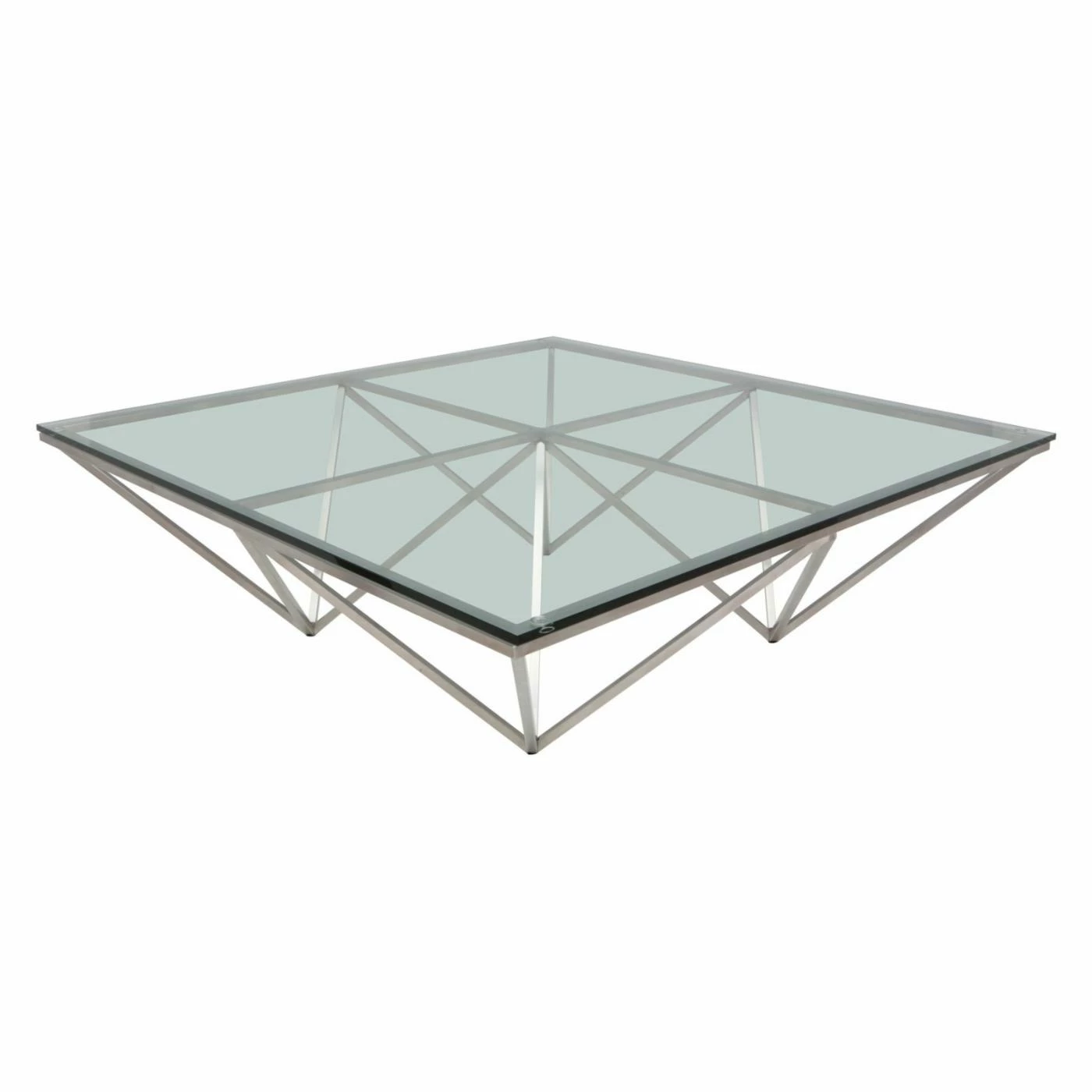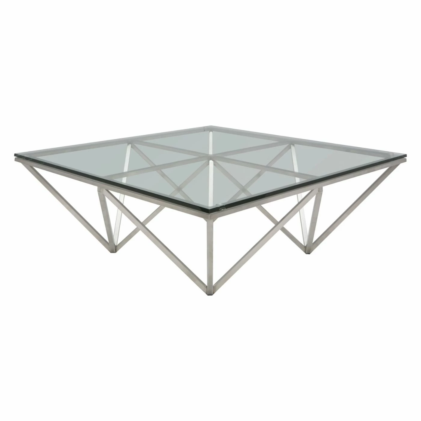 The Nuevo Origami Square Coffee Table takes all notions of what a coffee table could be, then turns them firmly on their heads. Made from durable brushed stainless steel, this piece affords you both reliable strength and an excellent texture for your space. The frame is peculiar in the best way, featuring four inverted pyramids which support a clear glass table top, tempered for your safety. This piece is exceptionally unique, yet will complement all manner of decorating schemes. Very cool.
