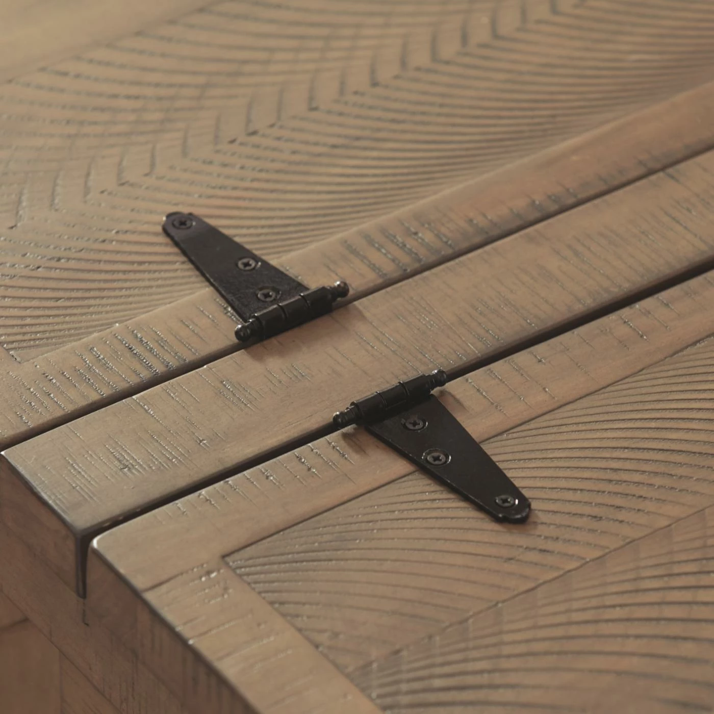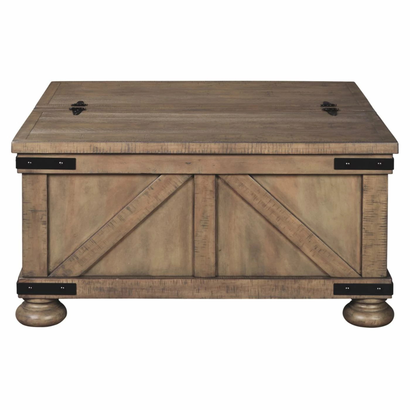 Complete your farmhouse living room with the Signature Design by Ashley Aldwin Storage Coffee Table. This large coffee table features a double-hinged top that opens to reveal plenty of storage space for blankets and other items you like to keep close. Round feet and metal trim details enhance the rustic look of the design.