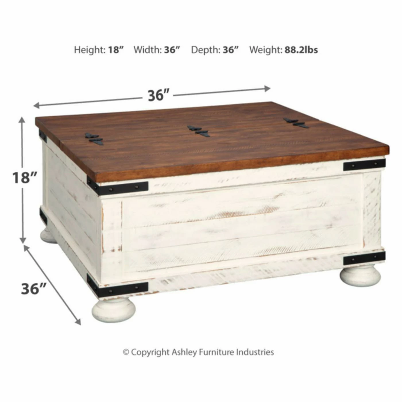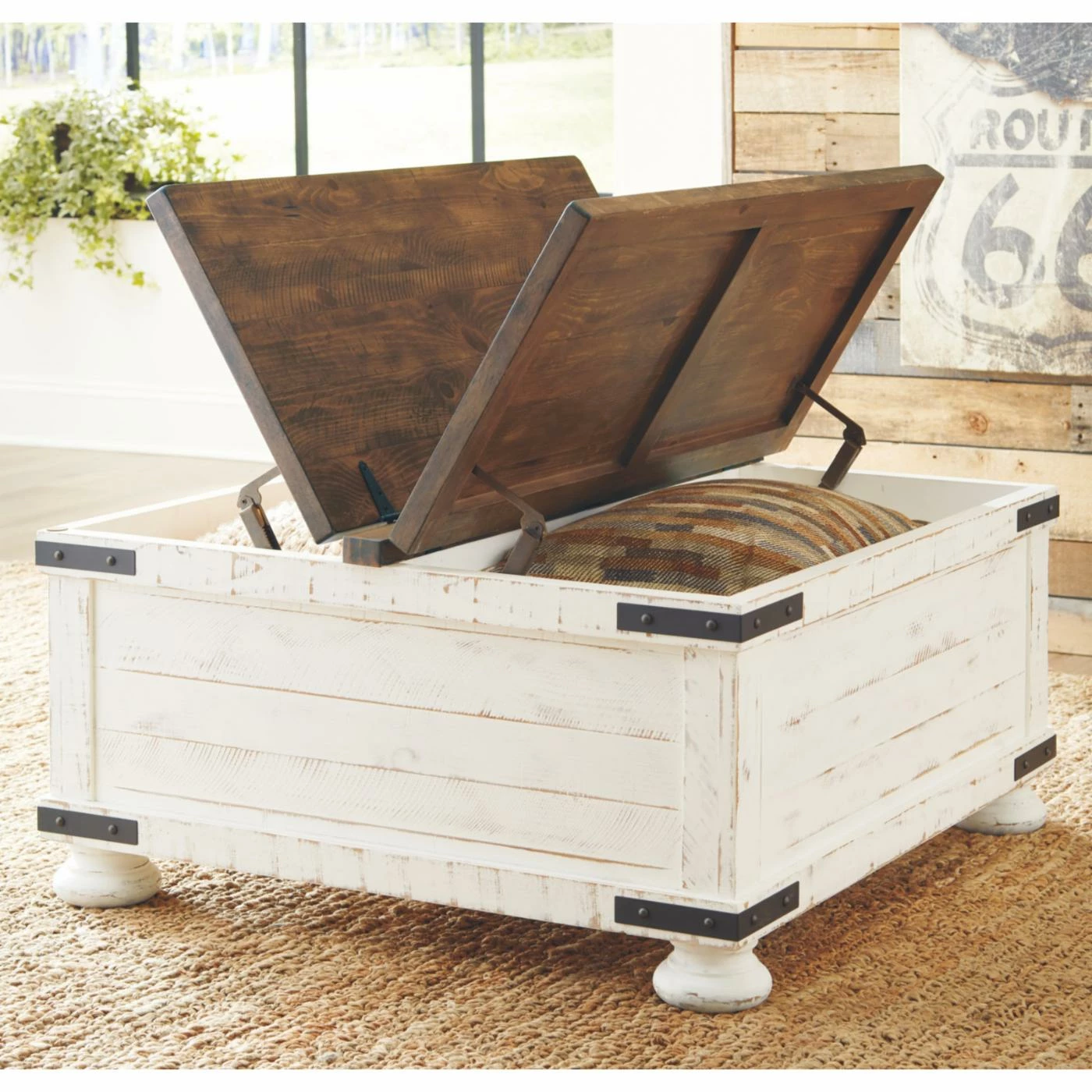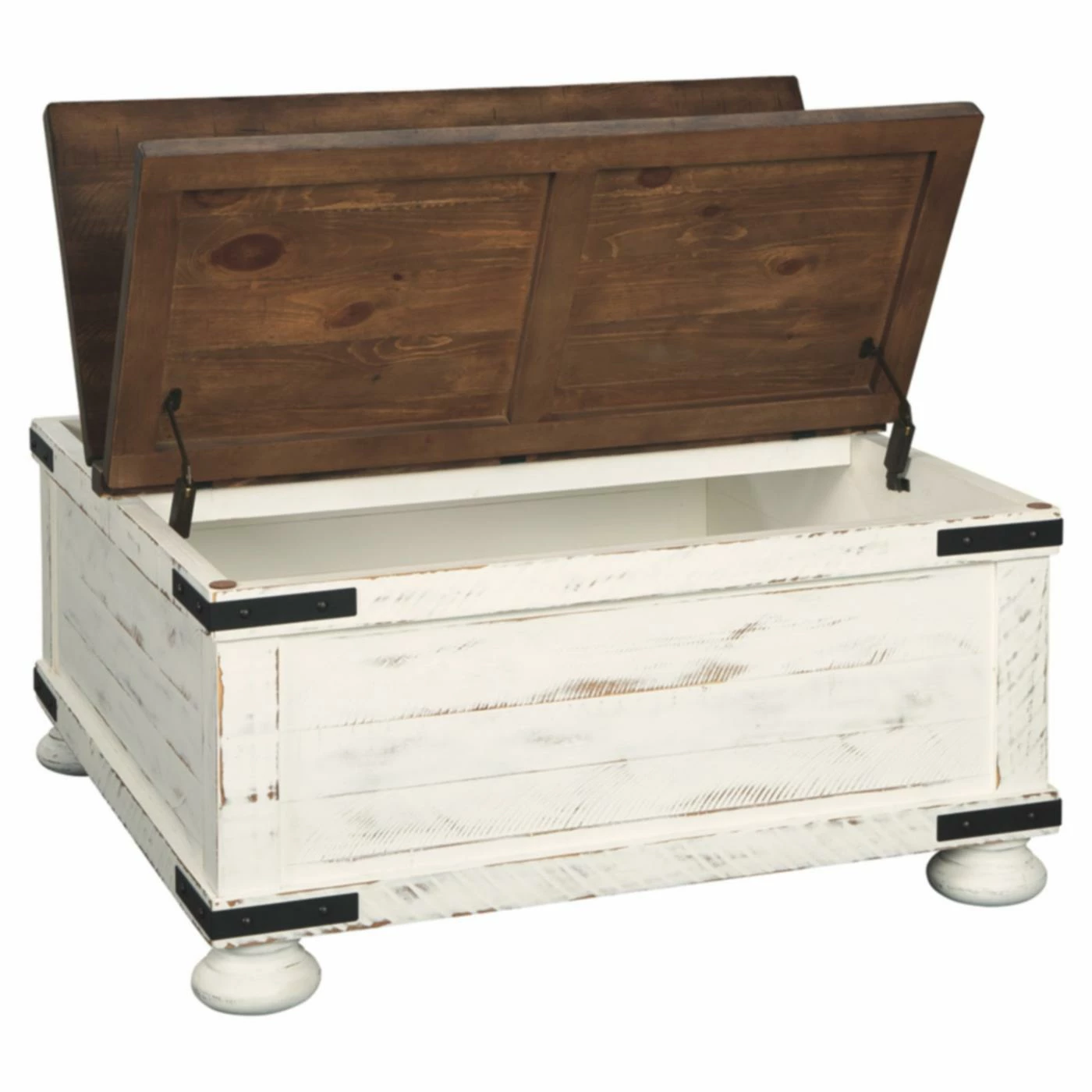 Bring a little farmhouse charm and ample storage space to your living room with the Signature Design by Ashley Wystfield Storage Coffee Table. This rustic coffee table features metal accents for an industrial finishing touch. The double-hinged lids open to provide plenty of room for blankets, pillows, and other items.